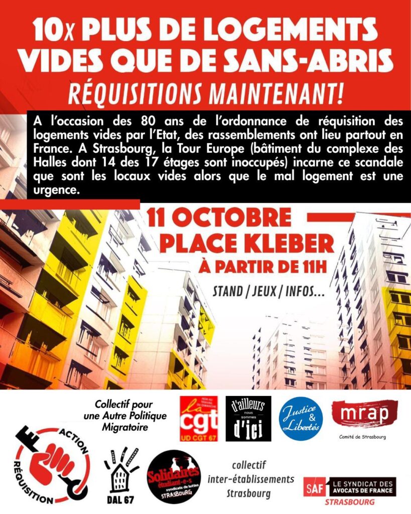 A l’occasion des 80 ans de l’ordonnance de réquisition des logements vides par l’Etat, des rassemblements ont lieu partout en France. A Strasbourg, la Tour Europe (bâtiment du complexe des Halles dont 14 des 17 étages sont inoccupés) incarne ce scandale que sont les locaux vides alors que le mal logement est une urgence.