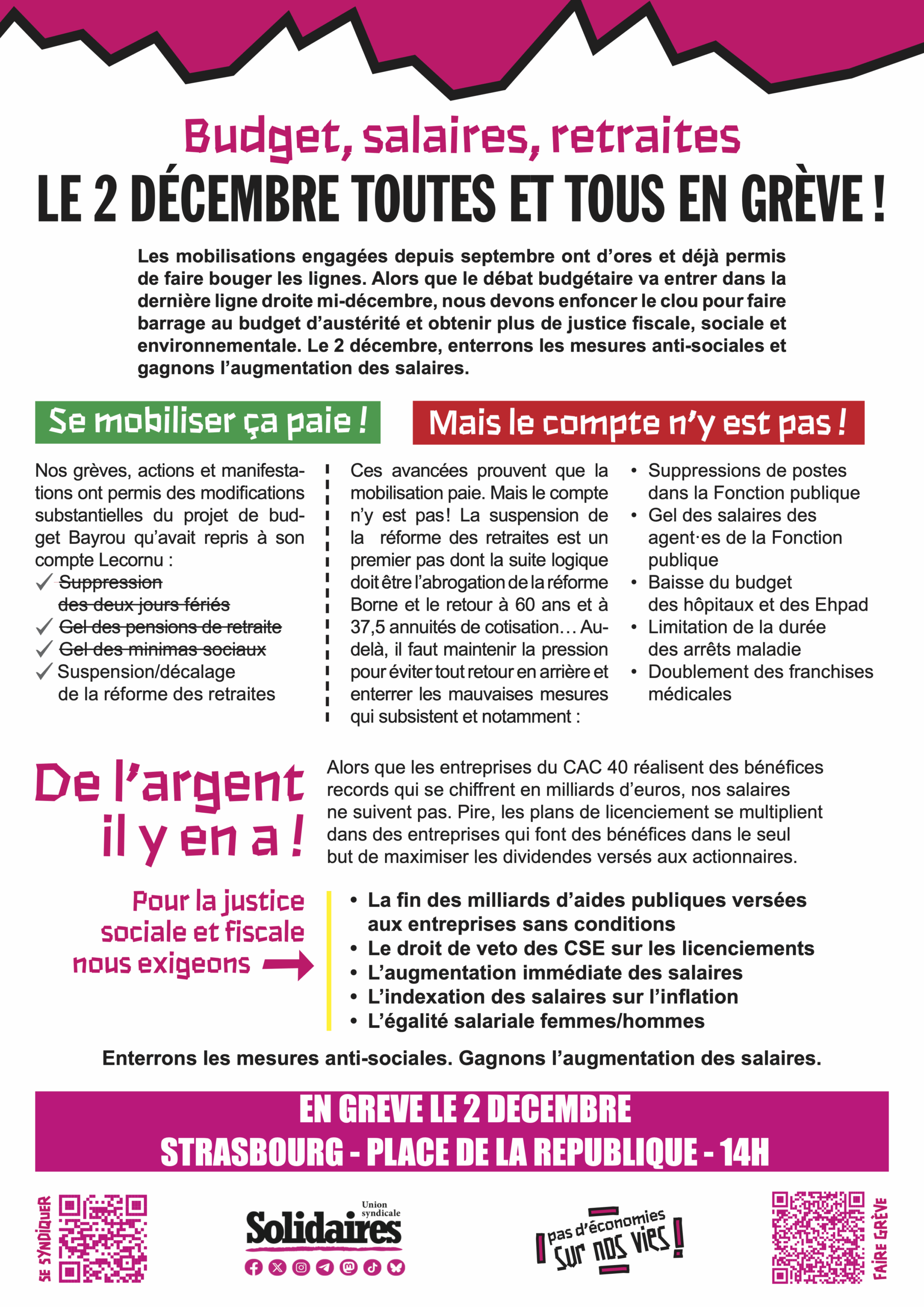 Les mobilisations engagées depuis septembre ont d’ores et déjà permis de faire bouger les lignes. Alors que le débat budgétaire va entrer dans la dernière ligne droite mi-décembre, nous devons enfoncer le clou pour faire barrage au budget d’austérité et obtenir plus de justice fiscale, sociale et environnementale. Le 2 décembre, enterrons les mesures anti-sociales et gagnons l’augmentation des salaires.