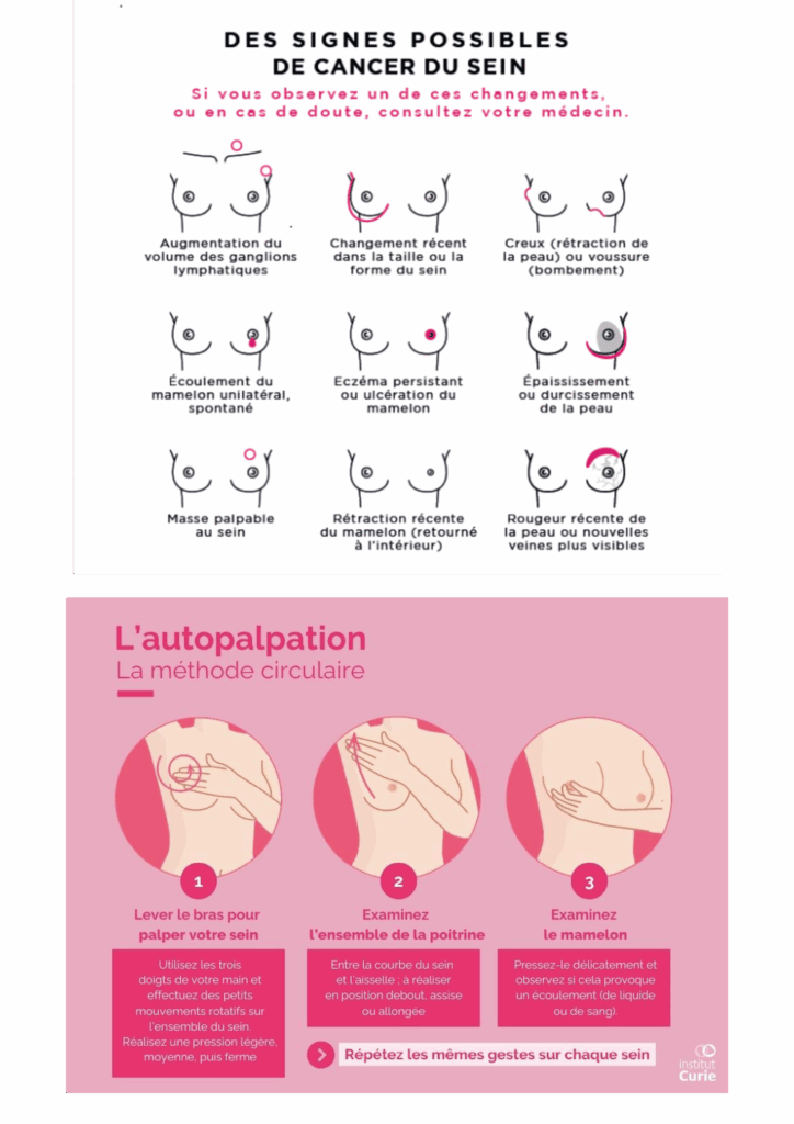 A la distribution éphémère de ruban rose, nous préférons des messages concrets. Apposons et diffusons dans tous les lieux de travail ces affiches en recto du tract. Des signes avant-coureurs d’un cancer peuvent être détectés par soi-même mais pour cela il faut en avoir été informée !