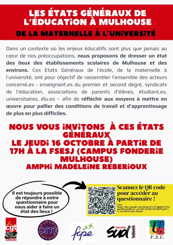 Nous vous invitons à ces états généraux le jeudi 16 octobre à partir de 17h à la FSESJ (campus fonderie Mulhouse) amphi Madeleine Reberioux.