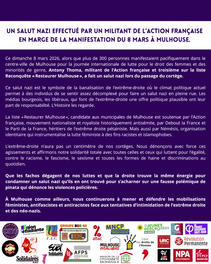 Ce dimanche 8 mars 2026, alors que plus de 300 personnes manifestaient pacifiquement dans le centre-ville de Mulhouse pour la journée internationale de lutte pour le droit des femmes et des minorités de genre, Antony Thoma, militant de l’Action française et troisième sur la liste Reconquête « Restaurer Mulhouse », a fait un salut nazi lors du passage du cortège.